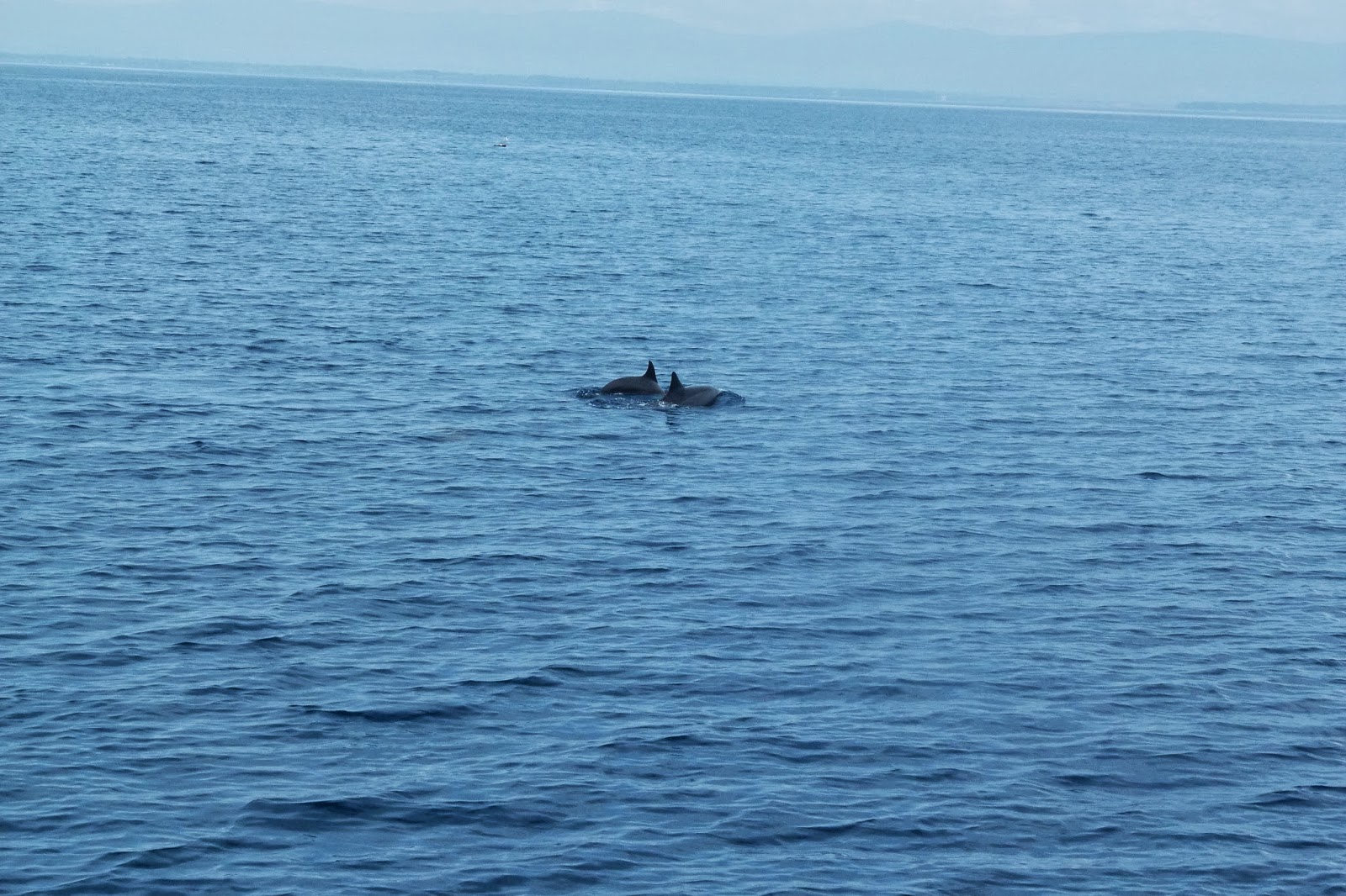 Tenim la sort de trobar dofins. És un grup de tres o quatre, que juguen al voltant de la barca, passen per sota, emergeixen per l’altre banda... no paren quiets i és un plaer veure’ls.